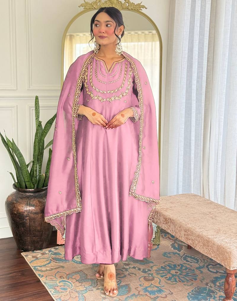 Baby Pink Embroidered Vichitra Silk Sequins Work Ethnic Kurtis