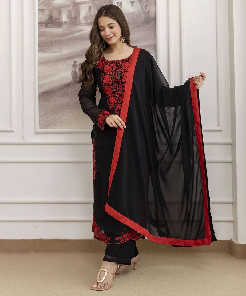 • Product Id : 4722854 • Package Details : 1 Kurti / 1 Pant / 1 Dupatta • Type : Kurta Sets • Occasion : Ceremonial • Fabric : Georgette • Work : Embroidered • Type : Thread Work • Look : Traditional • Sleeve : Quarter Sleeve • Neck Style : Round Neck • Color : Black • Stitching : Stitched Payments [+]