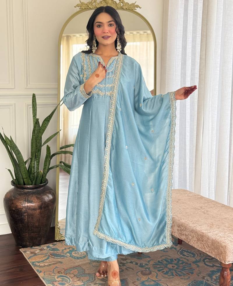 • Product Id : 4716776 • Package Details : 1 Kurti / 1 Pant / 1 Dupatta • Type : Kurta Sets • Work : Embroidered • Type : Sequins Work • Look : Traditional • Sleeve : Quarter Sleeve • Neck Style : V Neck • Color : Blue • Stitching : Stitched • Fabric : Vichitra Silk • Length : 45.0 Payments [+]