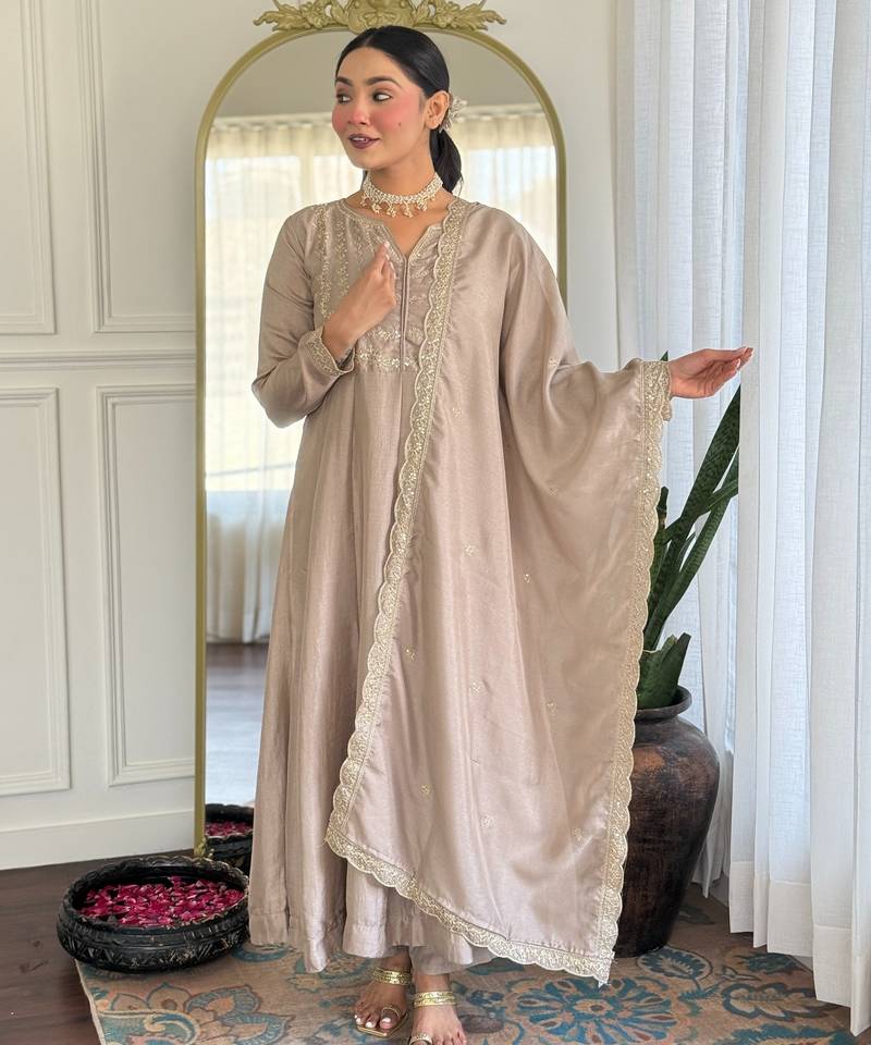• Product Id : 4716777 • Package Details : 1 Kurti / 1 Pant / 1 Dupatta • Type : Kurta Sets • Work : Embroidered • Type : Sequins Work • Look : Traditional • Sleeve : Quarter Sleeve • Neck Style : V Neck • Color : Brown • Stitching : Stitched • Fabric : Vichitra Silk • Length : 45.0 Payments [+]