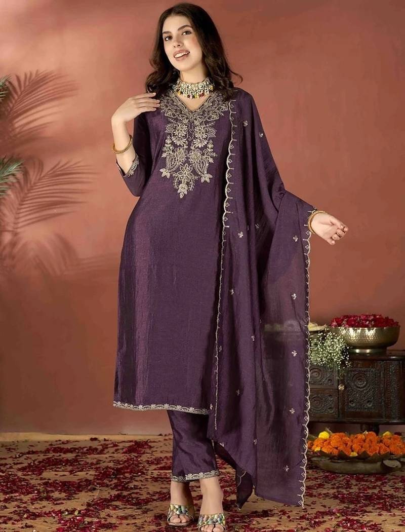 • Product Id : 4716775 • Package Details : 1 Kurti / 1 Pant / 1 Dupatta • Type : Kurta Sets • Occasion : Ceremonial • Work : Embroidered • Type : Zari Work • Look : Traditional • Sleeve : Quarter Sleeve • Neck Style : V Neck • Color : Dark Wine • Stitching : Stitched • Fabric : Vichitra Silk • Length : 45.0 • Side Slit : Yes Payments [+]