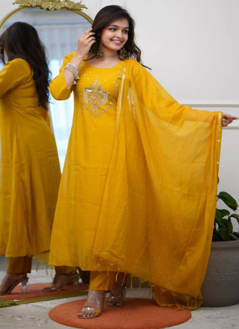 • Product Id : 4722856 • Package Details : 1 Kurti / 1 Pant / 1 Dupatta • Type : Kurta Sets • Occasion : Ceremonial • Fabric : Chanderi • Work : Embroidered • Type : Sequins Work • Look : Traditional • Sleeve : Quarter Sleeve • Neck Style : Round Neck • Color : Dark Yellow • Stitching : Stitched Payments [+]