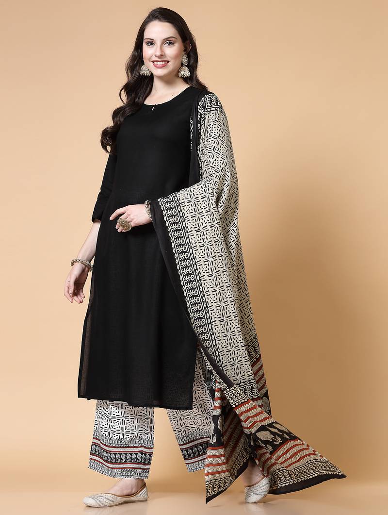 Women Black Solid Print Kurta Palazzo With Dupatta Set Stitched