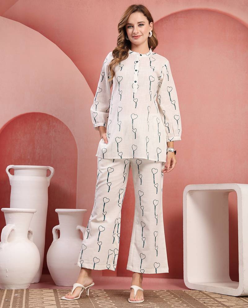 tyles cotton blend fabric co-ord set, crafted with meticulous attention to detail, this ensemble exudes sophistication and grace. the co-ord set features intricate printed adorning the neckline, sleeves, and hemline, adding a touch of opulence to its classic silhouette.Product Details:- Co ords Sets Fabric:- Pure Cotton Pattern:- Printed Fabric Care:- Machine Wash, Pack of:- 1 Top With 1 Pyjama Co ords Sets , Top Length, 28 Inches And Pyjama Length, 38 Inches, Colors, - Digital Printed Co ords Sets.