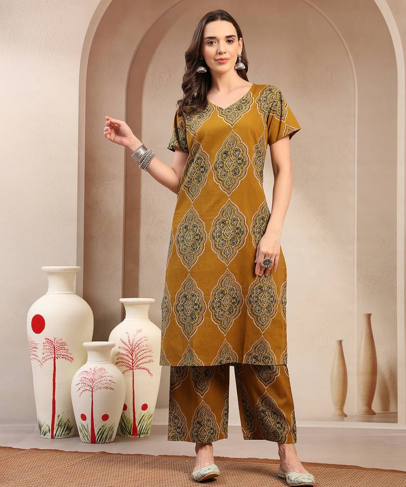Crafted From A High Quality Cotton Blend, This Kurta Delivers Comfort And Breathability. The Fabric Combines The Natural Softness Of Rayon With Enhanced Durability, Ensuring A Lightweight And Enduring Garment. Ideal For Extended Wear During Festive Occasions, This Cotton Blend Keeps You Cool And Comfortable Even In Warmer Weather. The Refined Texture Of The Fabric Maintains Its Shape And Elegance Throughout The Day. Printed Straight Kurta With Pant Set.
