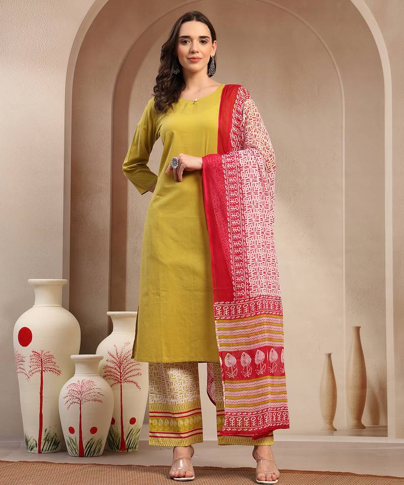 Crafted From A High Quality Rayon Cotton Blend, This Kurta Delivers Comfort And Breathability. The Fabric Combines The Natural Softness Of Rayon With Enhanced Durability, Ensuring A Lightweight And Enduring Garment. Ideal For Extended Wear During Festive Occasions, This Rayon Cotton Blend Keeps You Cool And Comfortable Even In Warmer Weather. The Refined Texture Of The Fabric Maintains Its Shape And Elegance Throughout The Day. Solid Printed Straight Kurta Palazzo With Dupatta Set 3/4 Sleeves Round Neck