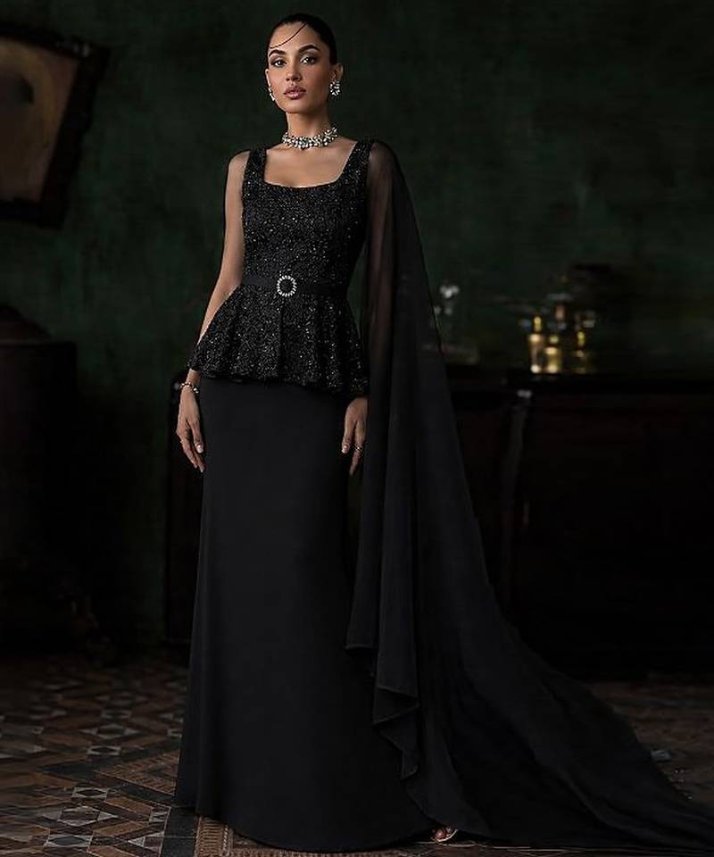 • Product Id : 4716622 • Package Details : 1 Peplum Top / 1 Skirt / 1 Cape • Type : Fusion Wear • Fabric : Net • Work : Embroidered • Look : Fashion • Sleeve : Sleeveless • Color : Black • Stitching : Stitched • Length : 35.0 Payments [+]