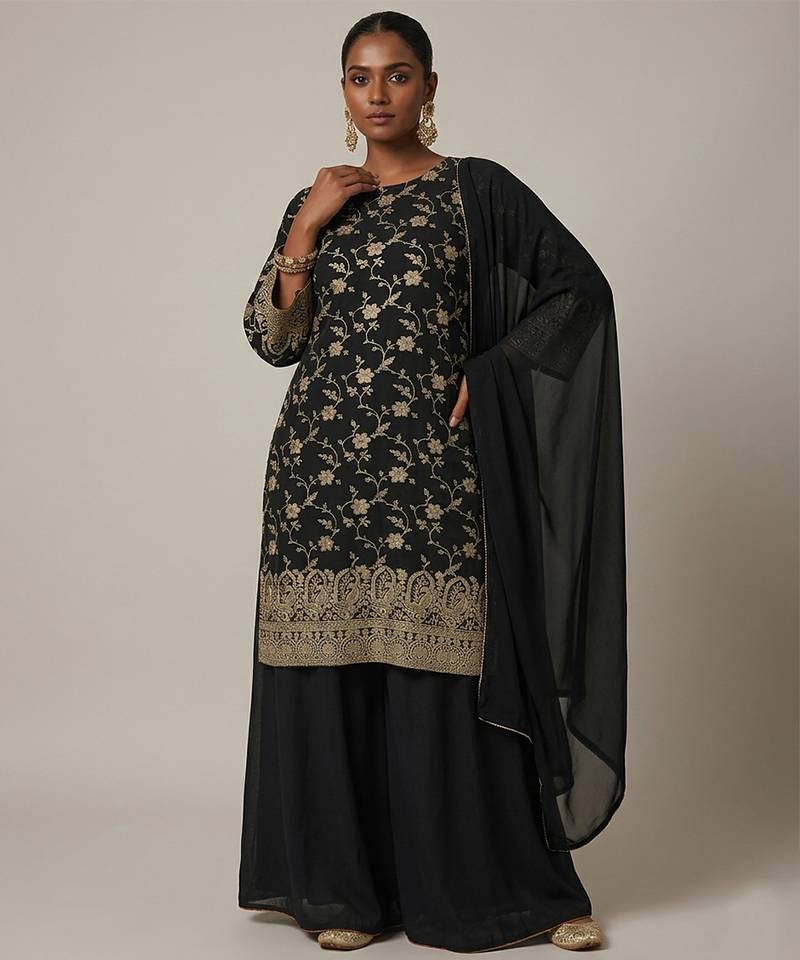 • Product Id : 4737006 • Package Details : 1 Kurta / 1 Sharara / 1 Dupatta • Type : Sharara Sets • Fabric : Tissue • Work : Embroidered • Type : Zari Work • Look : Traditional • Sleeve : Quarter Sleeve • Color : Black • Stitching : Stitched • Length : 35.0 Payments [+]
