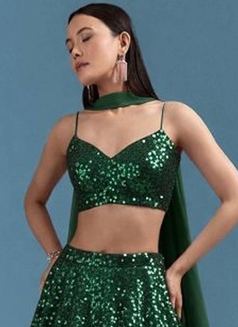 This Emerald Green Georgette Lehenga Set Is Adorned With Intricate Embroidery That Enhances Its Regal Charm. Ideal For Weddings And Grand Celebrations.