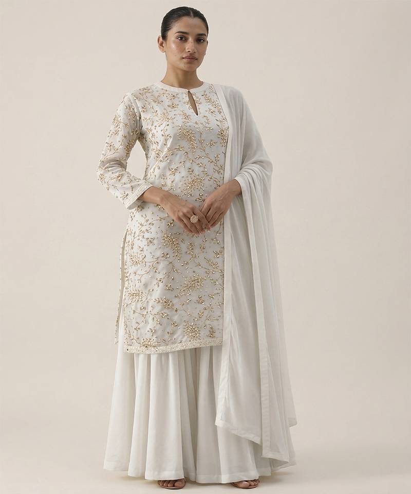 This Ivory Crepe Sharara Set Features Elegant Prints That Enhance Its Understated Charm. The Lightweight Fabric Ensures Comfort, While The Flared Sharara Adds Movement And Grace. Perfect For Festive Occasions, It Pairs Beautifully With Minimal Accessories For A Refined And Modern Ethnic Look.