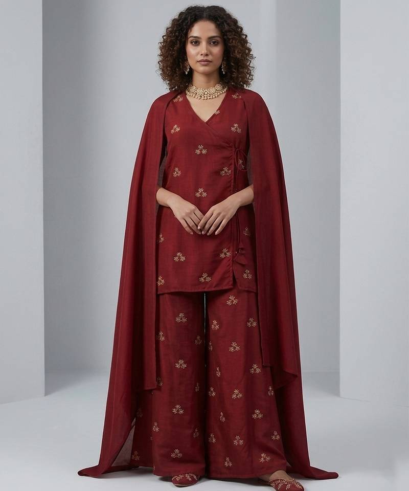 This Maroon Silk Sharara Set Features Intricate Embroidery That Enhances Its Rich And Festive Appeal. The Luxurious Fabric Offers A Smooth Texture, While The Flared Sharara Adds Graceful Movement. Perfect For Weddings And Celebrations, It Pairs Beautifully With Statement Jewelry For A Regal And Sophisticated Look.