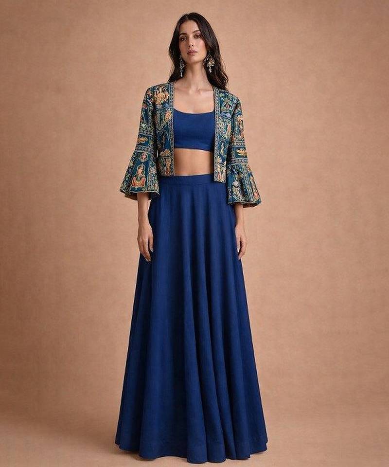 This Navy Blue Chiffon Lehenga Jacket Set Blends Traditional Elegance With Modern Layering. The Flowy Chiffon Fabric Offers Graceful Movement While The Jacket Adds A Contemporary Touch. Styled With A Coordinated Blouse And Lehenga, It Is Perfect For Festive Occasions, Weddings, And Stylish Cultural Celebrations.