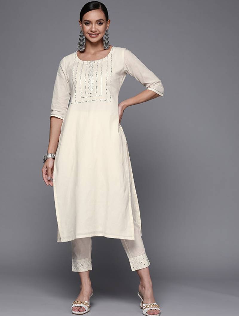 Off White Yoke Design Mirror Work Kurta