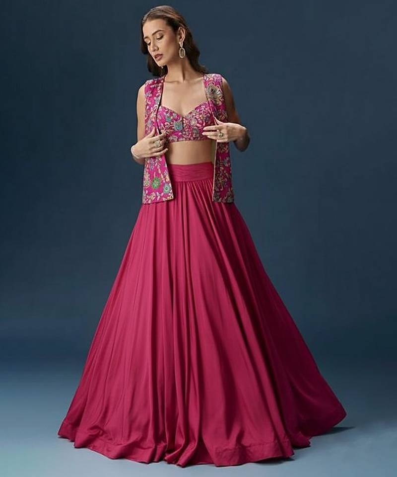 This Pink Crepe Lehenga Jacket Set Offers A Graceful Silhouette With A Modern Layered Design. The Lightweight Fabric Ensures Comfort While The Jacket Adds Refined Style. Perfect For Festive Gatherings And Celebrations.