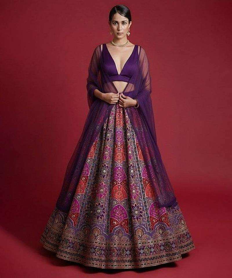 This Purple Crepe Lehenga Set Features Vibrant Prints That Enhance Its Festive Appeal. The Soft Fabric Ensures Comfort While The Flared Silhouette Adds Charm.