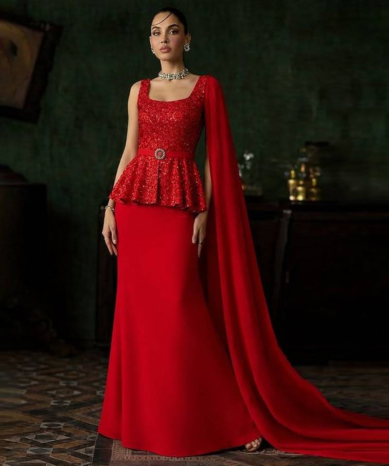 • Product Id : 4716600 • Package Details : 1 Peplum Top / 1 Skirt / 1 Cape • Type : Fusion Wear • Fabric : Net • Work : Embroidered • Look : Fashion • Sleeve : Sleeveless • Color : Red • Stitching : Stitched • Length : 35.0 Payments [+]