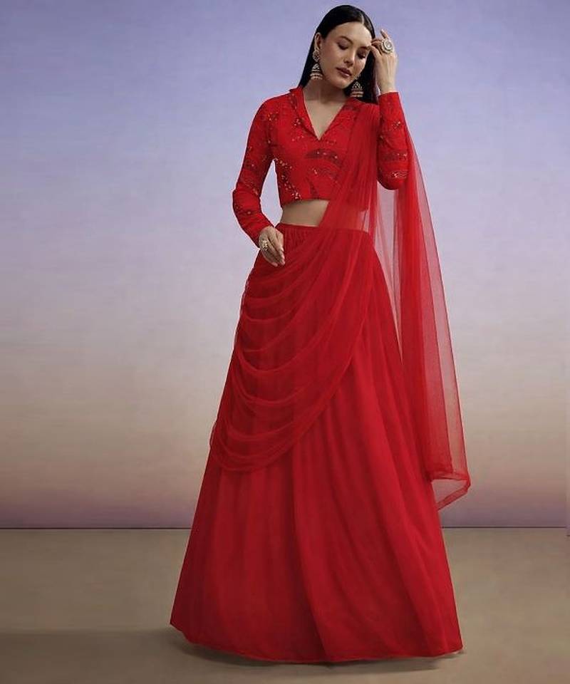 This Red Georgette Lehenga Set Combines Vibrant Color With Soft Flowing Fabric For Timeless Festive Elegance. Perfect For Weddings And Celebrations.
