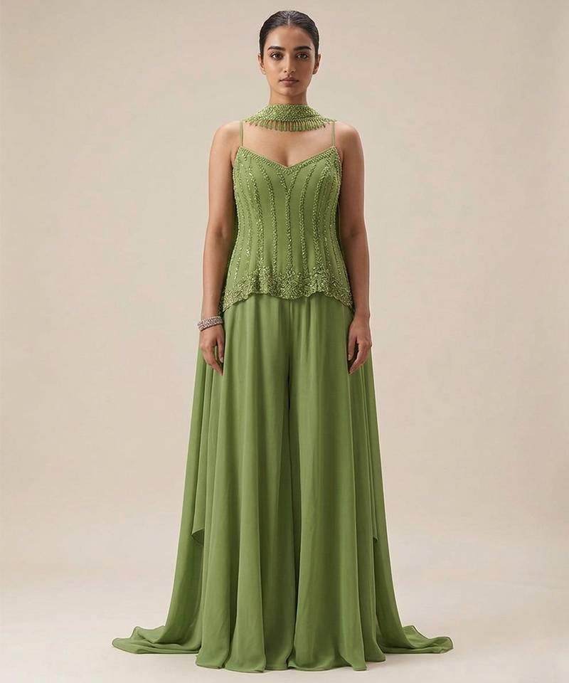 This Sage Green Crepe Sharara Set Features Intricate Embroidery That Adds A Graceful Touch. The Soft Fabric Ensures Comfort While The Flared Sharara Creates Elegant Movement. Perfect For Festive Occasions, It Pairs Beautifully With Traditional Accessories For A Refined And Stylish Ensemble.