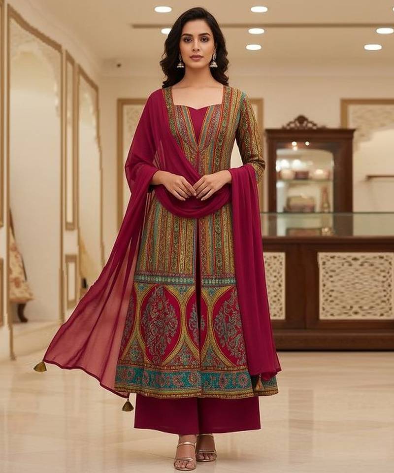 • Product Id : 4716587 • Package Details : 1 Anarkali / 1 Pant / 1 Dupatta • Type : Anarkali • Fabric : Brocade • Work : Printed • Look : Traditional • Sleeve : Full Sleeve • Color : Wine • Stitching : Stitched • Length : 35.0 Payments [+]