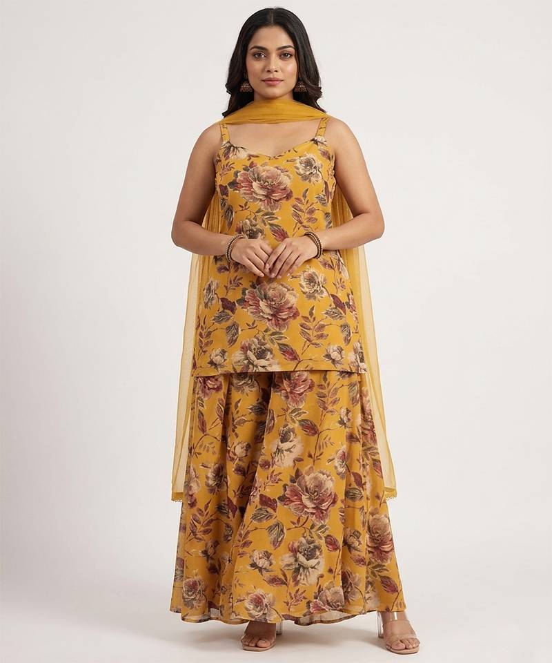 • Product Id : 4736998 • Package Details : 1 Kurta / 1 Sharara / 1 Dupatta • Type : Sharara Sets • Fabric : Silk • Work : Printed • Type : Floral Print • Look : Traditional • Sleeve : Sleeveless • Color : Yellow • Stitching : Stitched • Length : 35.0 Payments [+]