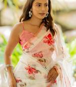 White Organza Floral Print Golden Gota Work Golden Border Saree
