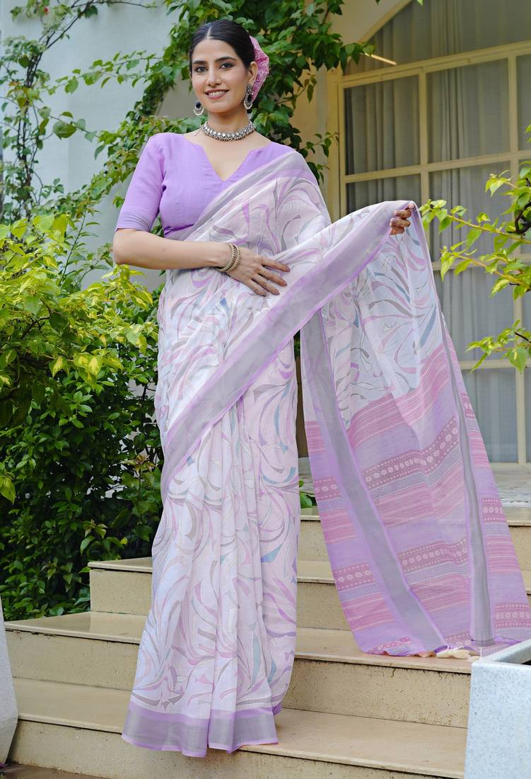 • Saree : Color- White / Fabric- Cotton • Blouse : Color- Lavender / Fabric- Cotton Saree Details