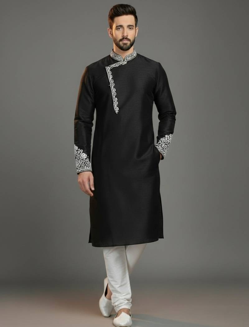 • Product Id : 4710367 • Package Details : 1 Kurta : 1 Pyjama • Type : Kurta Pajama • Fabric : Dupion • Work : Embroidered • Color : Black • Top Color : Black • Top Fabric : Dupion Silk • Stitching : Stitched Payments [+]