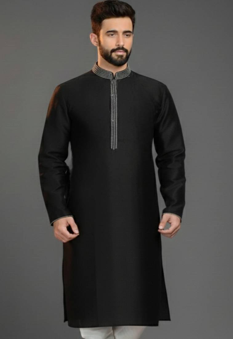 Black Embroidered Dupion Silk Kurta