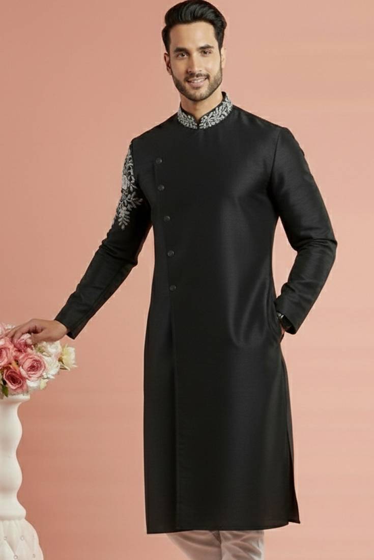 Black Embroidered Dupion Silk Kurta