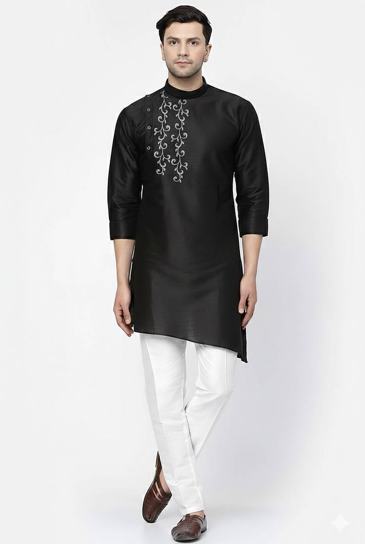 • Product Id : 4702820 • Package Details : 1 Kurta : 1 Pyjama • Type : Kurta Pajama • Fabric : Dupion • Work : Embroidered • Color : Black • Top Color : Black • Top Fabric : Dupion Silk • Stitching : Stitched Payments [+]