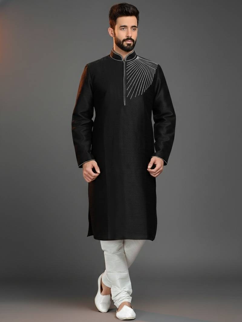 • Product Id : 4702786 • Package Details : 1 Kurta : 1 Pyjama • Type : Kurta Pajama • Fabric : Dupion • Work : Embroidered • Color : Black • Top Color : Black • Top Fabric : Dupion Silk • Stitching : Stitched Payments [+]