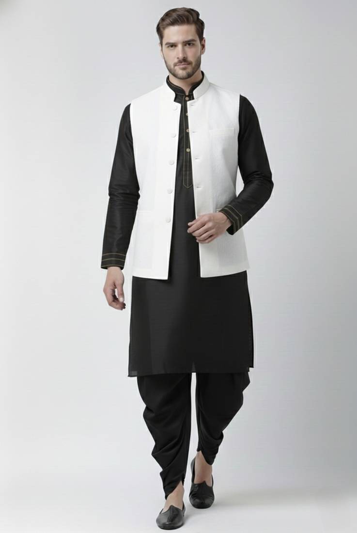 • Product Id : 4702775 • Package Details : 1 Kurta : 1 Dhoti / 1 Nehru Jacket • Type : Nehru Jacket • Fabric : Dupion • Work : Plain • Color : Black • Top Color : Black • Top Fabric : Dupion Silk • Stitching : Stitched Payments [+]
