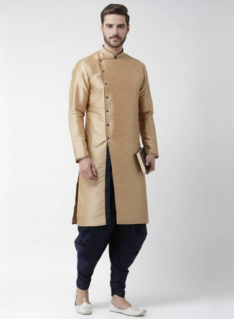 • Product Id : 4702857 • Package Details : 1 Kurta : 1 Dhoti • Type : Dhoti Kurta • Fabric : Dupion • Work : Embroidered • Color : Gold • Top Color : Gold • Top Fabric : Dupion Silk • Stitching : Stitched Payments [+]