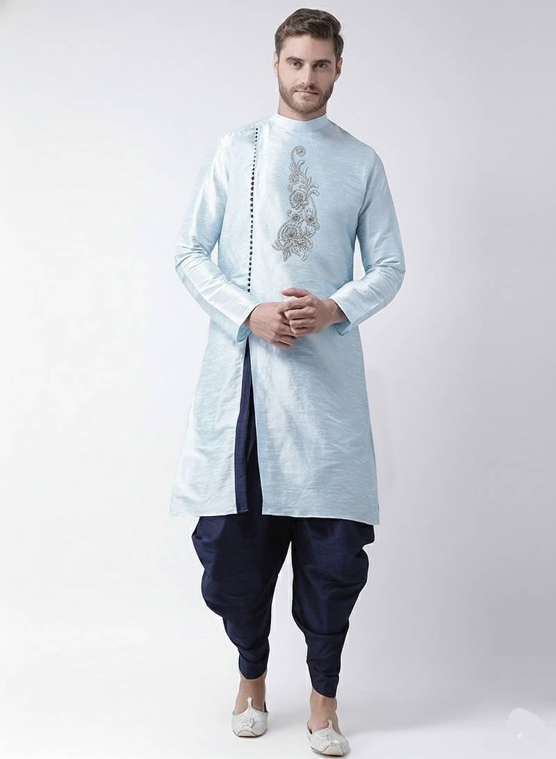 Light Blue Embroidered Dupion Silk Kurta Set