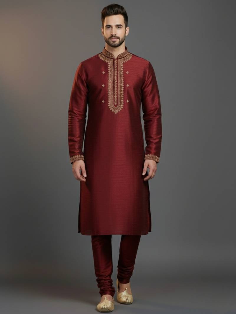 • Product Id : 4710387 • Package Details : 1 Kurta : 1 Pyjama • Type : Kurta Pajama • Fabric : Dupion • Work : Embroidered • Color : Maroon • Top Color : Maroon • Top Fabric : Dupion Silk • Stitching : Stitched Payments [+]