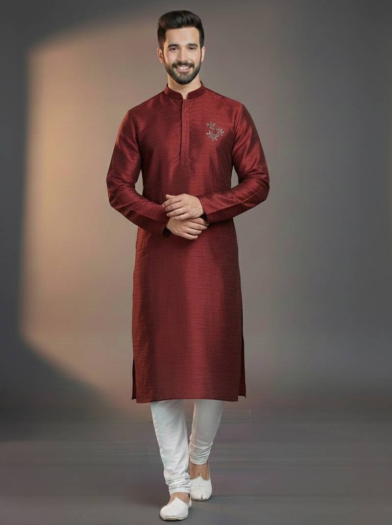 • Product Id : 4710371 • Package Details : 1 Kurta : 1 Pyjama • Type : Kurta Pajama • Fabric : Dupion • Work : Embroidered • Color : Maroon • Top Color : Maroon • Top Fabric : Dupion Silk • Stitching : Stitched Payments [+]