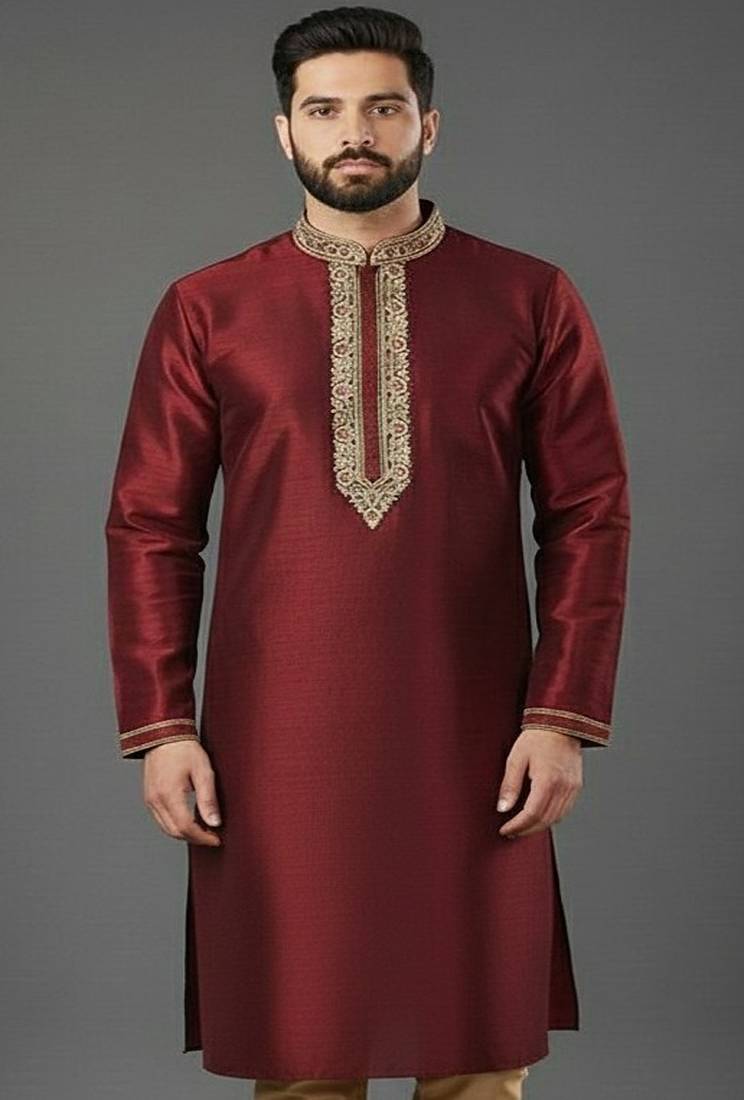 • Product Id : 4683560 • Package Details : 1 Kurta • Type : Kurta • Fabric : Dupion • Work : Embroidered • Color : Maroon • Top Color : Maroon • Top Fabric : Dupion Silk • Stitching : Stitched Payments [+]