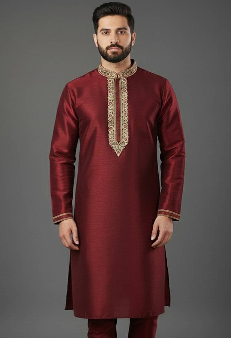 Maroon Embroidered Dupion Silk Kurta