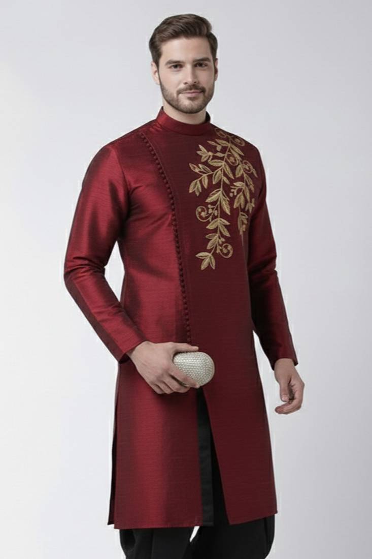 Maroon Embroidered Dupion Silk Kurta