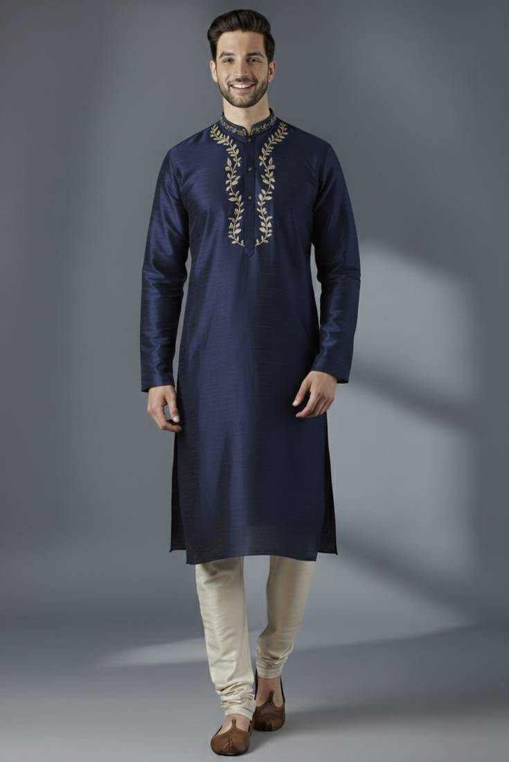 Navy Dupion Silk Embroidered Kurta Set