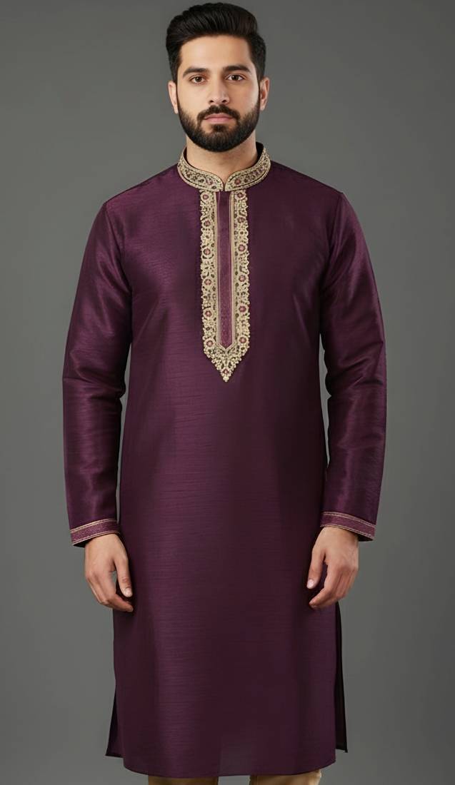 • Product Id : 4683559 • Package Details : 1 Kurta • Type : Kurta • Fabric : Dupion • Work : Embroidered • Color : Purple • Top Color : Purple • Top Fabric : Dupion Silk • Stitching : Stitched Payments [+]