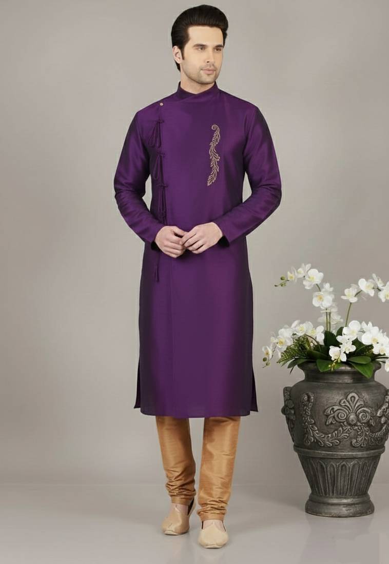 Purple Embroidered Dupion Silk Kurta Set