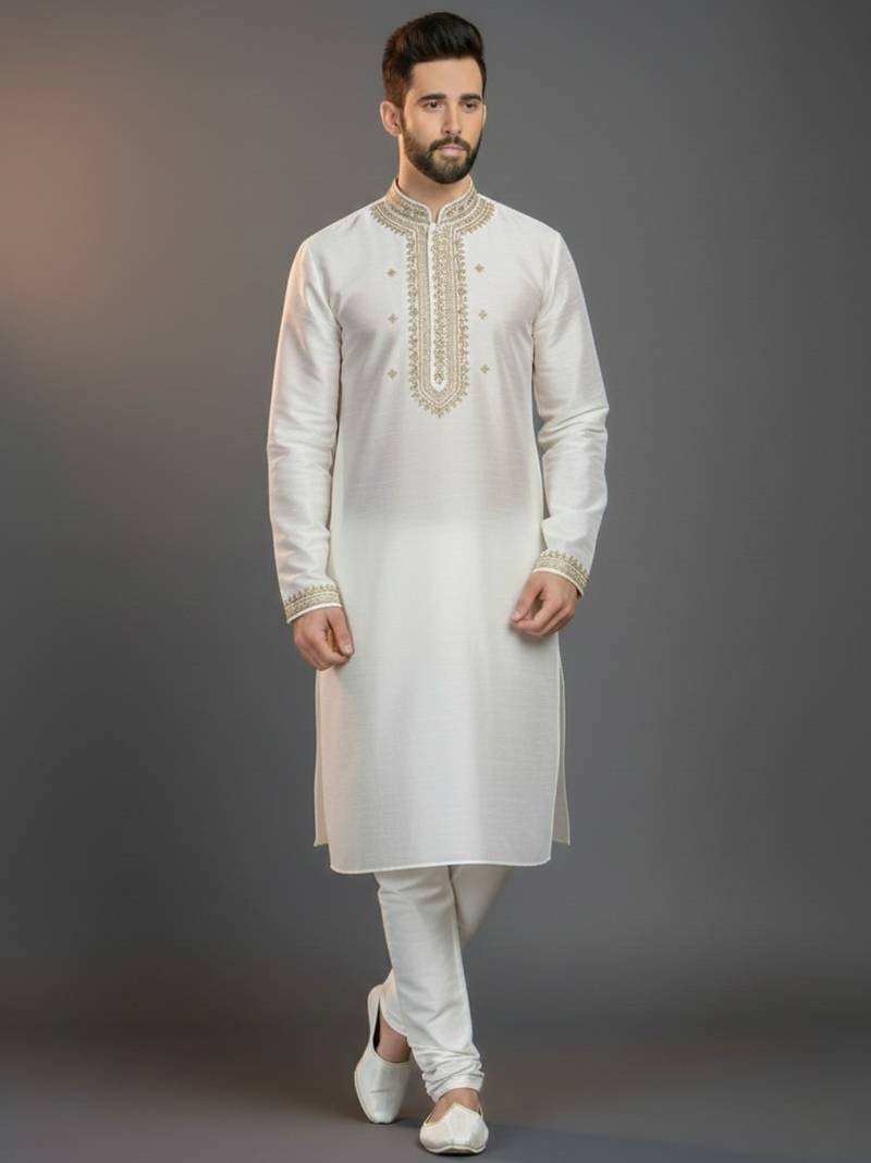 • Product Id : 4710384 • Package Details : 1 Kurta : 1 Pyjama • Type : Kurta Pajama • Fabric : Dupion • Work : Embroidered • Color : White • Top Color : White • Top Fabric : Dupion Silk • Stitching : Stitched Payments [+]