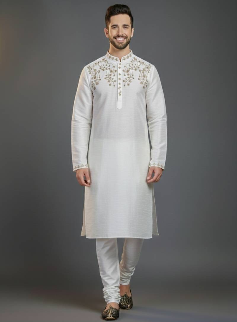White Dupion Silk Embroidered Kurta Set