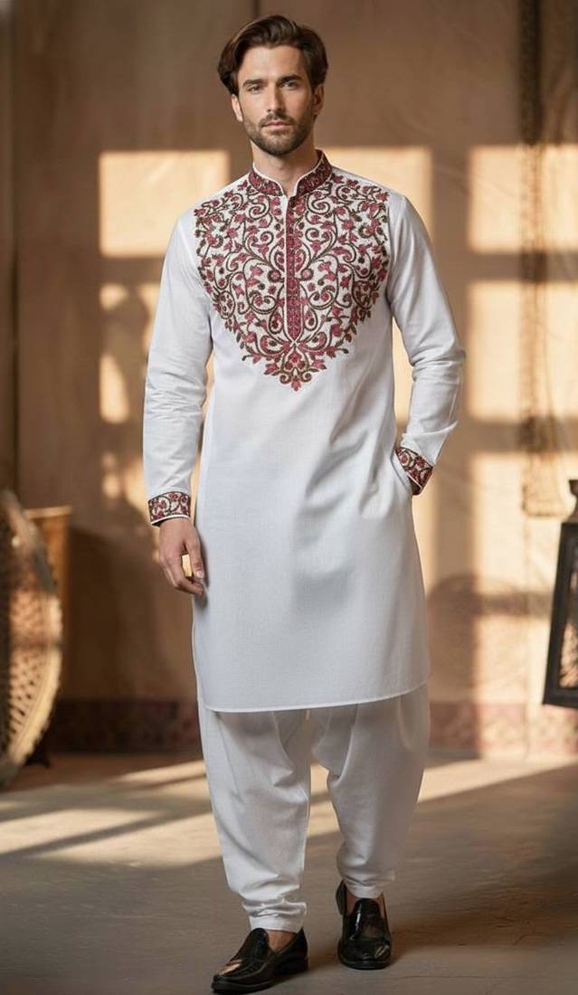 • Product Id : 4702812 • Package Details : 1 Kurta : 1 Pyjama • Type : Kurta Pajama • Fabric : Cotton • Work : Embroidered • Color : White • Top Color : White • Top Fabric : Cotton • Stitching : Stitched Payments [+]