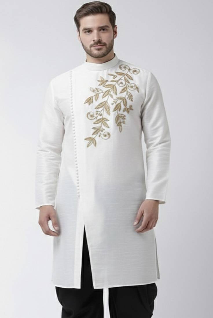 White Embroidered Dupion Silk Kurta