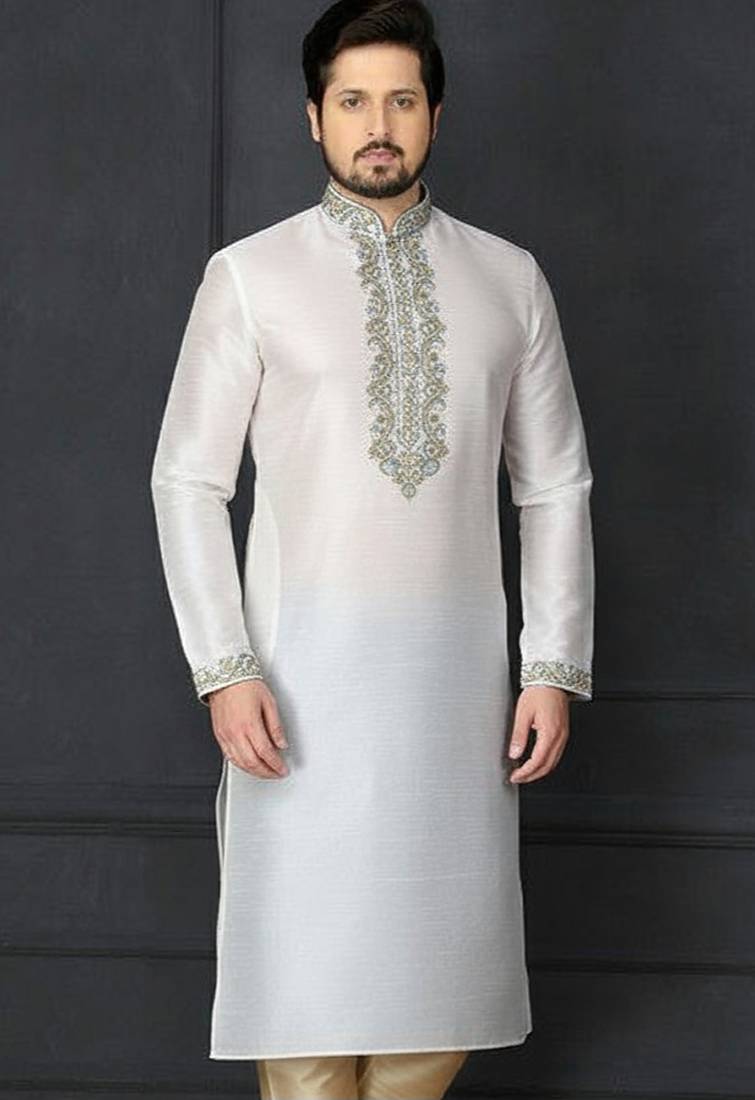 White Embroidered Dupion Silk Kurta
