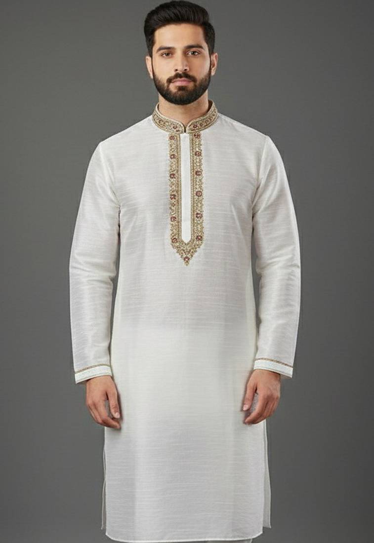 White Embroidered Dupion Silk Kurta