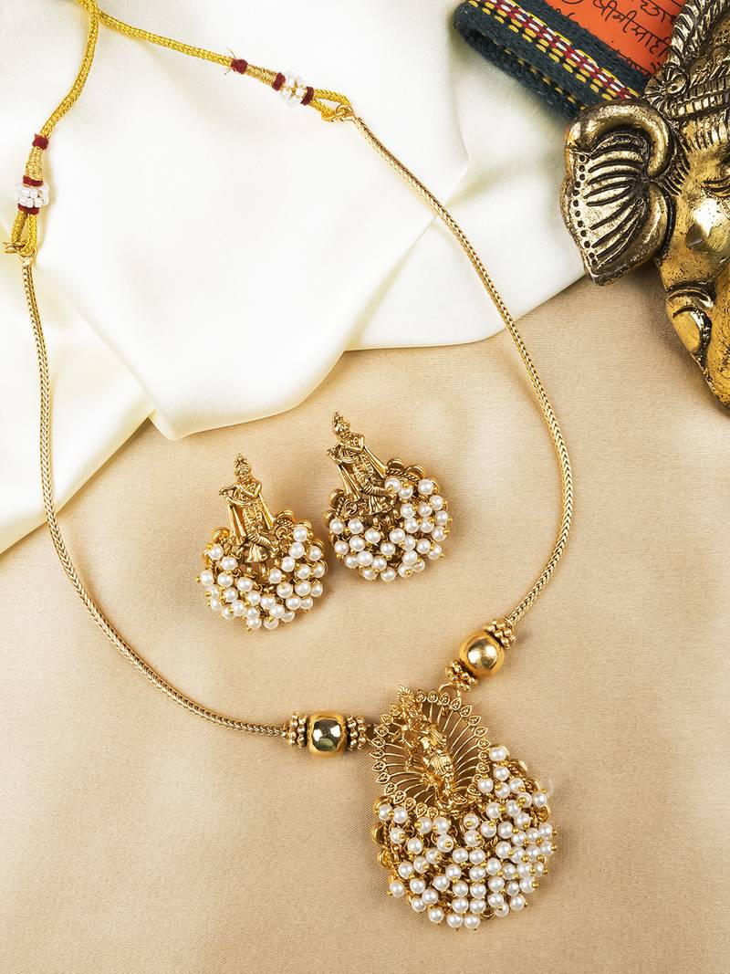• Product Id : 4674950 • Package Details : 1 Necklace & 2 Earrings • Type : Necklace Designs • Occasion : Wedding • Look : Traditional • Jewellery Work : Gold Plated • Color : White • Plating : Antique Gold • Base Material : Copper • Piercing : Yes • Pearl Type : Na • Height : 20.0 • Width : 5.0 • Speciality : Gold Plated Divine Motif Pendant Set • Care : Wipe Your Jewellery With A Soft Cloth After Every Use Always Store Your Jewellery In A Flat Box To Avoid Accidental Scratches Keep Sprays And Perfumes Away From Your Jewellery • Finish : Matte Payments [+]