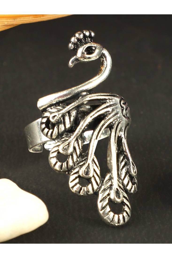 Alluring Designer Silver Plated Peacock Style Oxidised Adjustable Ring